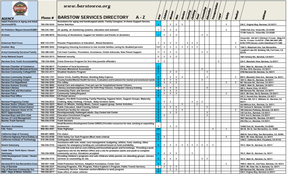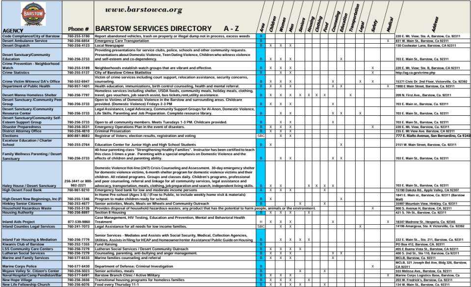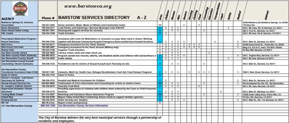 This section of the website is dedicated to the residents of Barstow. Here you will find local community information and services that make living in Barstow unique, fun, and convenient. Use the navigation menu to the left for more information.